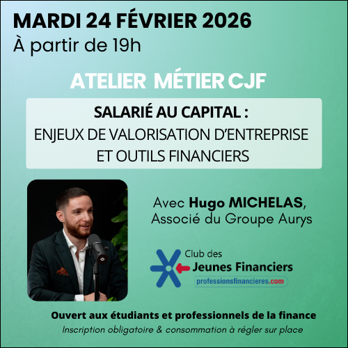 Le Club des Jeunes Financiers vous propose un atelier-métier à Paris. Une rencontre thématique avec Hugo Michelas, Associé du Groupe Aurys, afin d’échanger sur le sujet : « salarié au capital : enjeux de valorisation d'entreprise et outils financiers ».
